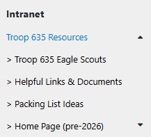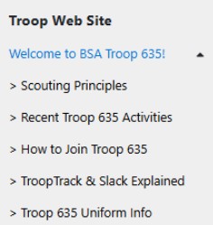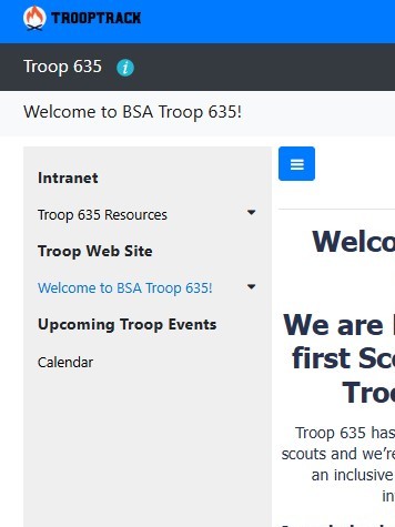 - Selecting the blue “hamburger” menu shows links to Troop 635’s Public and Private web pages.