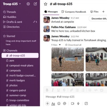 - Channels allow conversations about specific topics from Campout information to Merit Badges to sharing Photos.