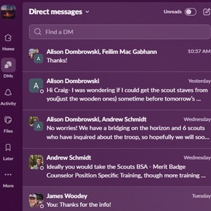 Where TroopTrack is mainly used for its event planning, calendar, and RSVP platform, the Slack app handles other communication tasks. Slack is the tool T635 uses to connect with each other or groups and receive general information.